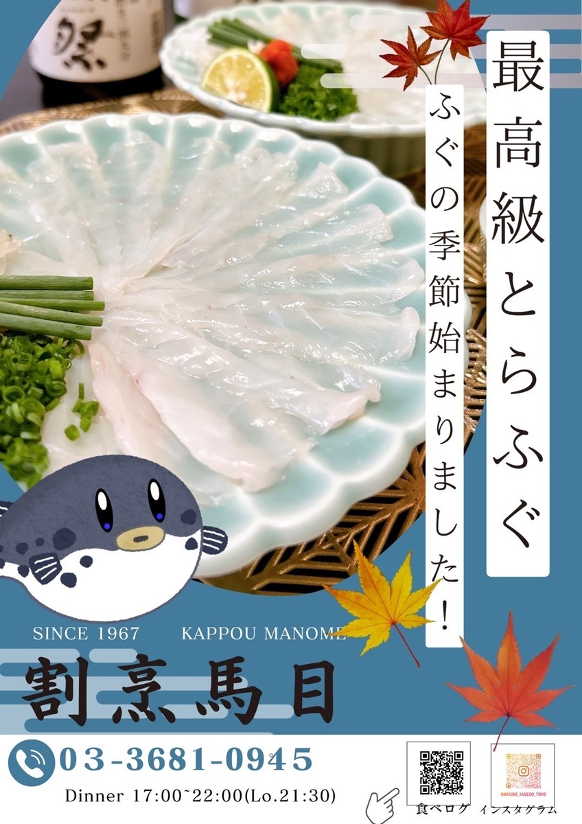 割烹 馬目でも、いよいよ ふぐの季節 が始まりました🐡🍂