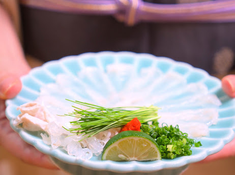 透き通るような「てっさ」: 繊細な薄造りのふぐ刺しを自家製ポン酢で。
